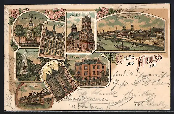 Lithographie Neuss a. Rh., Ständehaus, Rathaus, Münster