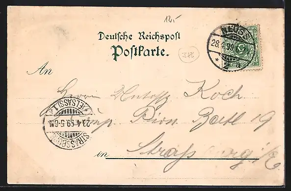 Personenbezogene Daten auf der Rückseite der Karte wurden durch blauen Textmarker unkenntlich gemacht. Die blauen Stellen sind auf die Vorderseite durchgeweicht und wirken sich negativ auf das Postkartenfoto aus