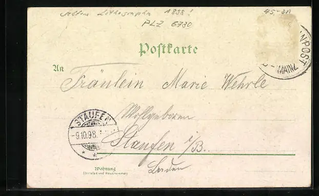 gelaufen 1898, Briefmarke entfernt, rückseitig Klebe- und Papierreste, Eckknick re. oben, guter Zustand