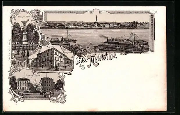 Lithographie Neuwied, Gymnasium, Landgerichtsplatz, Krieger-Denkmal