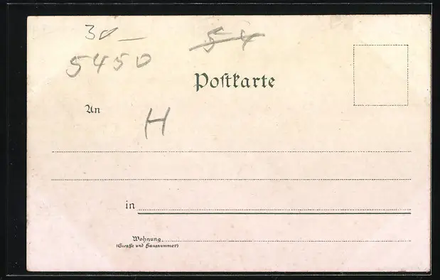 Personenbezogene Daten auf der Rückseite der Karte wurden durch blauen Textmarker unkenntlich gemacht. Die blauen Stellen sind auf die Vorderseite durchgeweicht und wirken sich negativ auf das Postkartenfoto aus