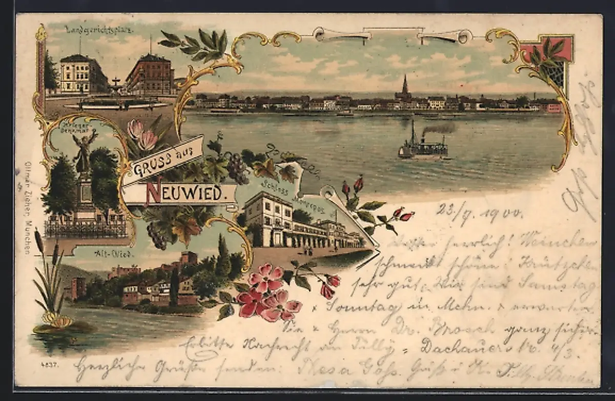 Lithographie Neuwied, Schloss Montrepos, Landgerichtsplatz, Krieger-Denkmal