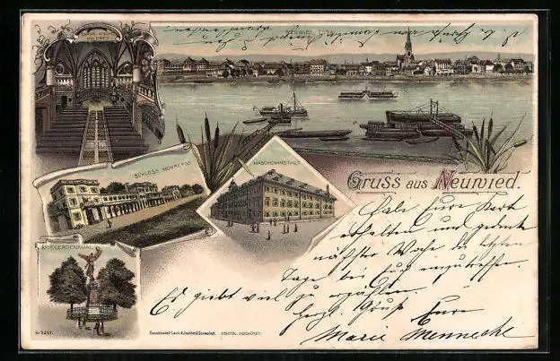 Lithographie Neuwied, Totalansicht, Schloss Monrepos, Kriegerdenkmal
