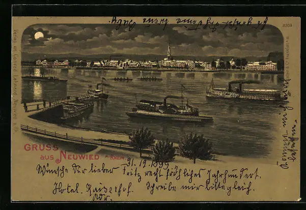 Lithographie Neuwied a. Rhein, Uferpartie mit Dampfern bei Mondschein