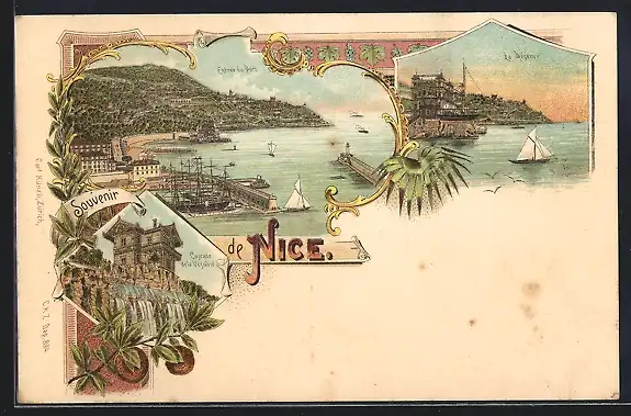 Lithographie Nice, Hafenansicht mit Segelschiffen, Cascade de la Vesubie
