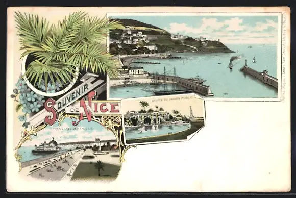 Lithographie Nice, Promenade des Anglais, GRotte du Jardin Public, Ortsansicht