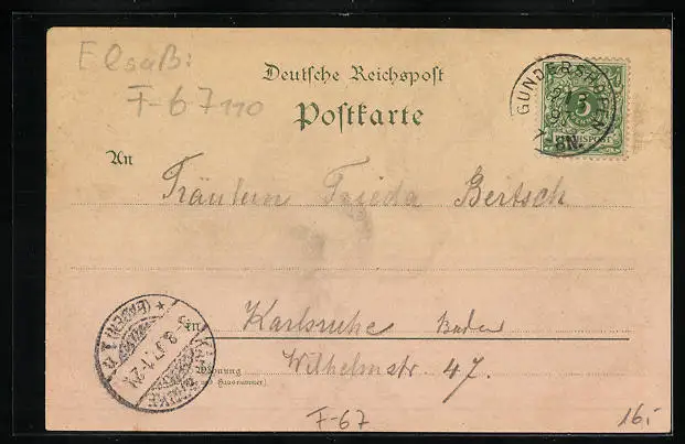Personenbezogene Daten auf der Rückseite der Karte wurden durch blauen Textmarker unkenntlich gemacht. Die blauen Stellen sind auf die Vorderseite durchgeweicht und wirken sich negativ auf das Postkartenfoto aus