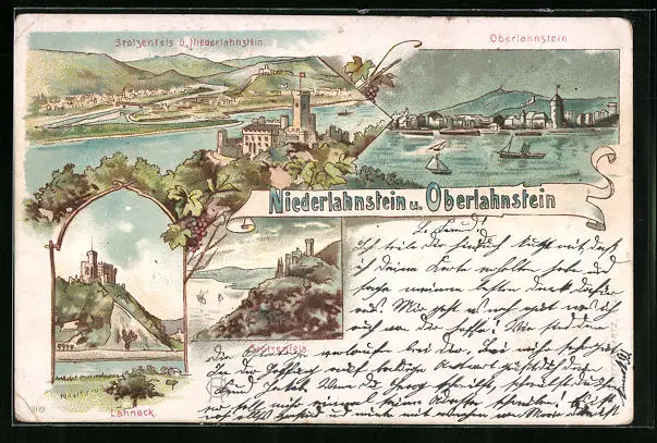 Lithographie Niederlahnstein, Ortsansicht Oberlahnstein, Stolzenfels