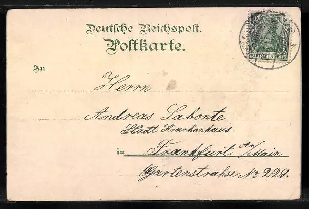Personenbezogene Daten auf der Rückseite der Karte wurden durch blauen Textmarker unkenntlich gemacht. Die blauen Stellen sind auf die Vorderseite durchgeweicht und wirken sich negativ auf das Postkartenfoto aus