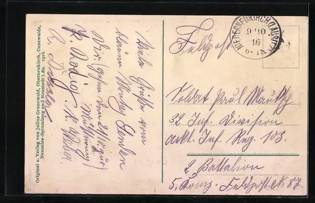 Personenbezogene Daten auf der Rückseite der Karte wurden durch blauen Textmarker unkenntlich gemacht. Die blauen Stellen sind auf die Vorderseite durchgeweicht und wirken sich negativ auf das Postkartenfoto aus