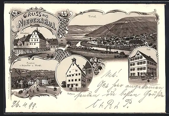 Lithographie Niedernhall, Götzenhaus, Fabrik v. Schaufler u. Wundt, Post