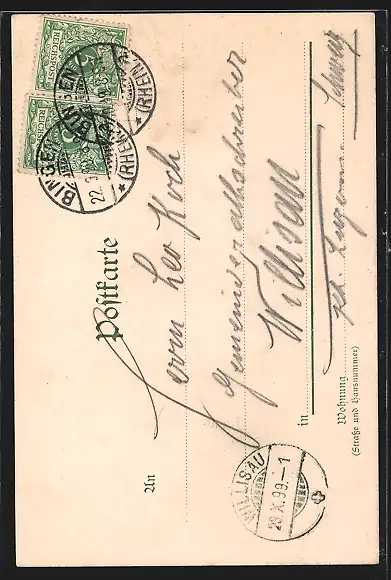 Personenbezogene Daten auf der Rückseite der Karte wurden durch blauen Textmarker unkenntlich gemacht. Die blauen Stellen sind auf die Vorderseite durchgeweicht und wirken sich negativ auf das Postkartenfoto aus