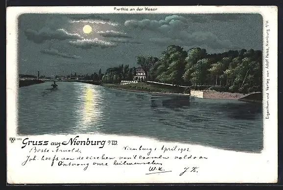 Lithographie Nienburg a. W., Partie an der Weser