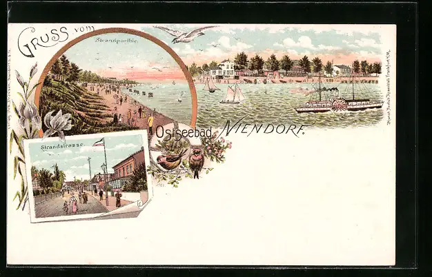 Lithographie Niendorf, Strandpartie und Strandstrasse