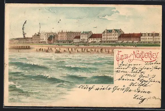 Lithographie Norderney, Küstenpanorama mit Strand und Stadtansicht