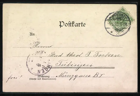 Personenbezogene Daten auf der Rückseite der Karte wurden durch blauen Textmarker unkenntlich gemacht. Die blauen Stellen sind auf die Vorderseite durchgeweicht und wirken sich negativ auf das Postkartenfoto aus