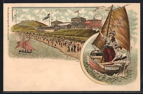 Lithographie Norderney, Zwei Frauen im Segelboot, Giftbude, Strandpartie