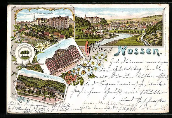 Lithographie Nossen, Ortsansicht, Schule, Seminar