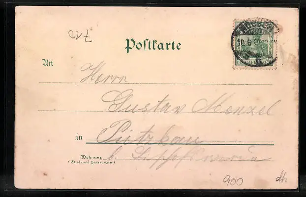 Personenbezogene Daten auf der Rückseite der Karte wurden durch blauen Textmarker unkenntlich gemacht. Die blauen Stellen sind auf die Vorderseite durchgeweicht und wirken sich negativ auf das Postkartenfoto aus