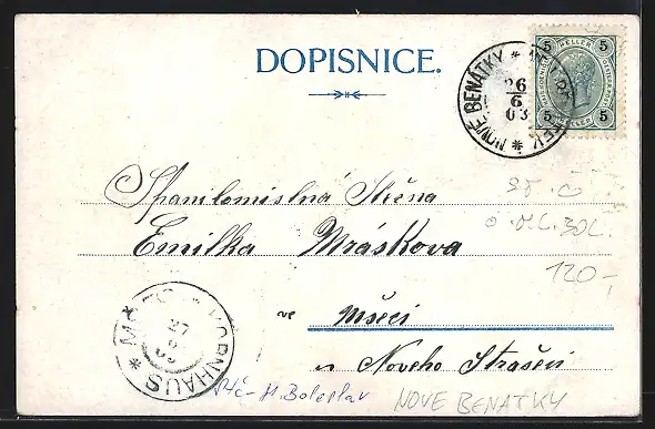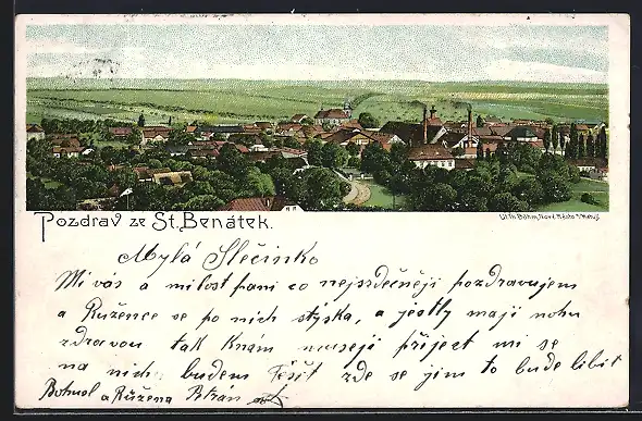 Lithographie Nove Benatky, Ortsansicht aus der Vogelschau