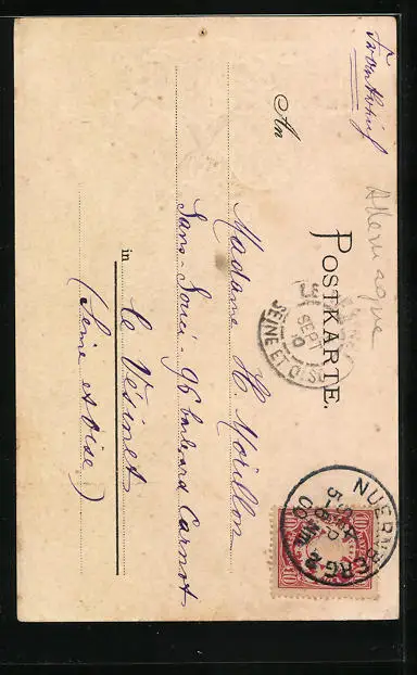 Personenbezogene Daten auf der Rückseite der Karte wurden durch blauen Textmarker unkenntlich gemacht. Die blauen Stellen sind auf die Vorderseite durchgeweicht und wirken sich negativ auf das Postkartenfoto aus