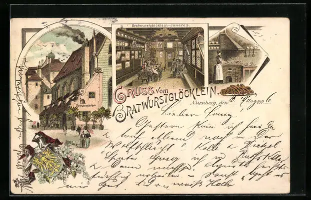 Lithographie Nürnberg, Bratwurstglöcklein innen und aussen, Stadtwappen
