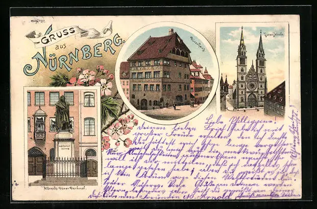 Lithographie Nürnberg, Dürerhaus, Florenzkirche, Dürerdenkmal