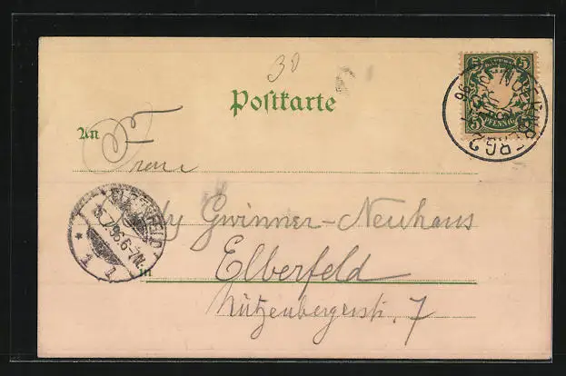 Personenbezogene Daten auf der Rückseite der Karte wurden durch blauen Textmarker unkenntlich gemacht. Die blauen Stellen sind auf die Vorderseite durchgeweicht und wirken sich negativ auf das Postkartenfoto aus