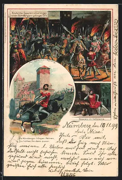 Lithographie Nürnberg, Märchen Raubritter Eppelein v. Gailingen, Spruch