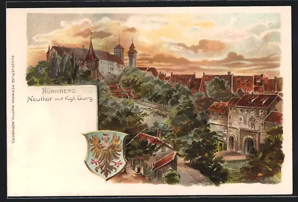 Lithographie Nürnberg, Neutor mit Königlicher Burg, Wappen