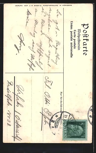 Personenbezogene Daten auf der Rückseite der Karte wurden durch blauen Textmarker unkenntlich gemacht. Die blauen Stellen sind auf die Vorderseite durchgeweicht und wirken sich negativ auf das Postkartenfoto aus