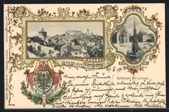 Lithographie Nürnberg, Schöner-brunnen, Teilansicht, mit Wappen