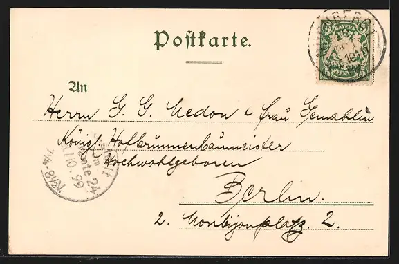 Personenbezogene Daten auf der Rückseite der Karte wurden durch blauen Textmarker unkenntlich gemacht. Die blauen Stellen sind auf die Vorderseite durchgeweicht und wirken sich negativ auf das Postkartenfoto aus