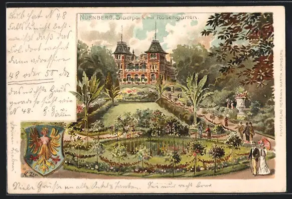 Lithographie Nürnberg, Stadtpark-Restaurant mit Rosengarten