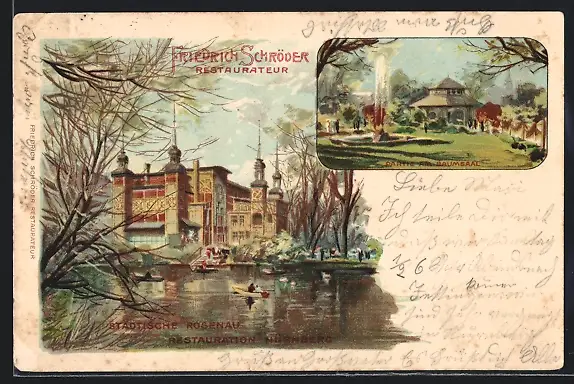 Lithographie Nürnberg, Städtische Rosenau Restauration, Partie am Baumsaal