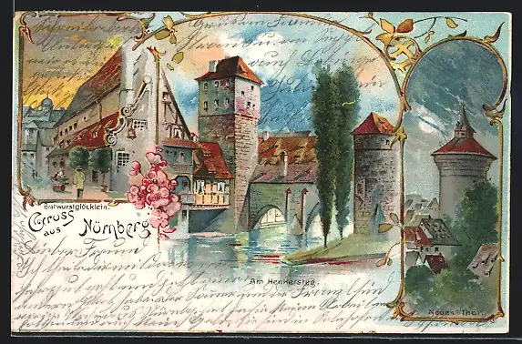 Lithographie Nürnberg, Strassenpartie, Turm, Brücke