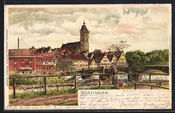 Lithographie Nürtingen, Ortsansicht mit Flusspartie
