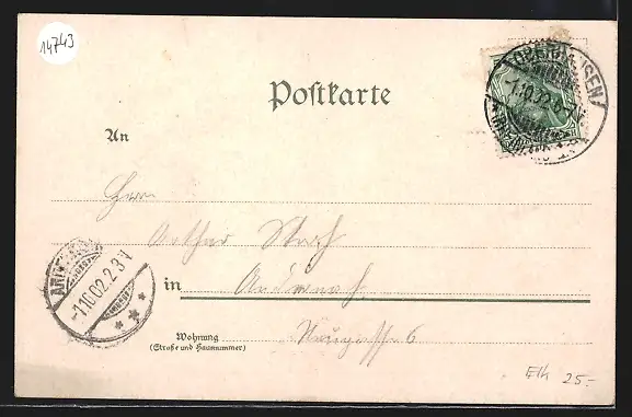 Personenbezogene Daten auf der Rückseite der Karte wurden durch blauen Textmarker unkenntlich gemacht. Die blauen Stellen sind auf die Vorderseite durchgeweicht und wirken sich negativ auf das Postkartenfoto aus