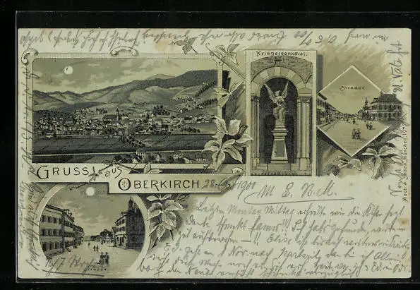 Lithographie Oberkirch, Kriegerdenkmal, Strassenansichten, Ortsansicht