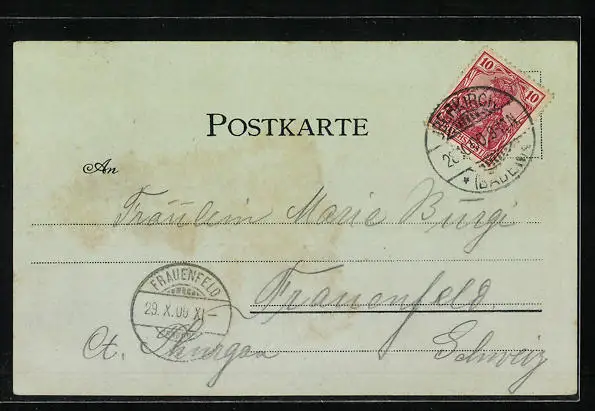 Personenbezogene Daten auf der Rückseite der Karte wurden durch blauen Textmarker unkenntlich gemacht. Die blauen Stellen sind auf die Vorderseite durchgeweicht und wirken sich negativ auf das Postkartenfoto aus