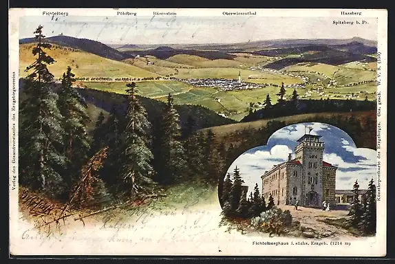 Lithographie Oberwiesenthal, Panoramaansicht, Fichtelberghaus