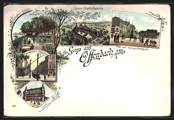 Lithographie Offenbach a. M., Kaiser Friedrichquelle, Post mit Kriegerdenkmal