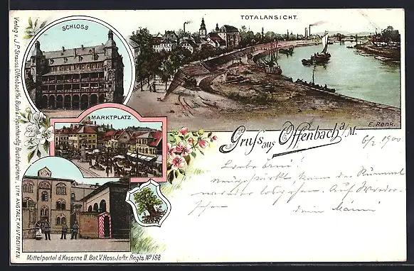 Lithographie Offenbach a. M., Totalansicht, Schloss, Markt, Kaserne, Wappen