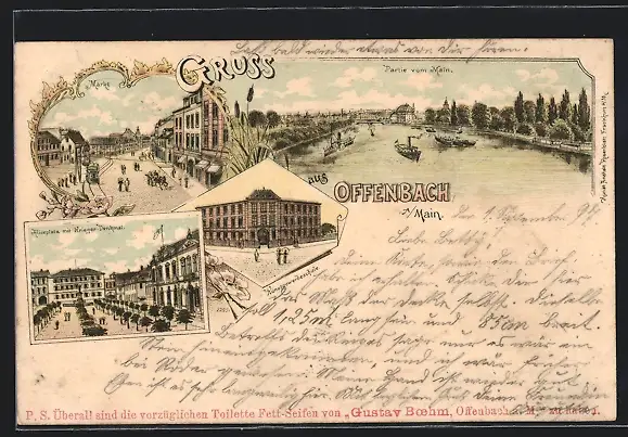 Lithographie Offenbach a. Main, Kunstgewerbeschule, Aliceplatz mit Krieger-Denkmal, Markt