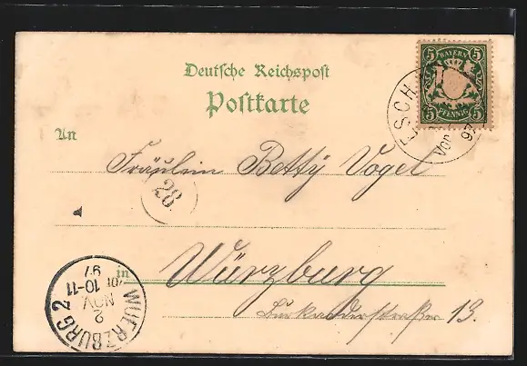 Personenbezogene Daten auf der Rückseite der Karte wurden durch blauen Textmarker unkenntlich gemacht. Die blauen Stellen sind auf die Vorderseite durchgeweicht und wirken sich negativ auf das Postkartenfoto aus