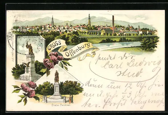 Lithographie Offenburg, Krieger-Denkmal, Drake-Denkmal