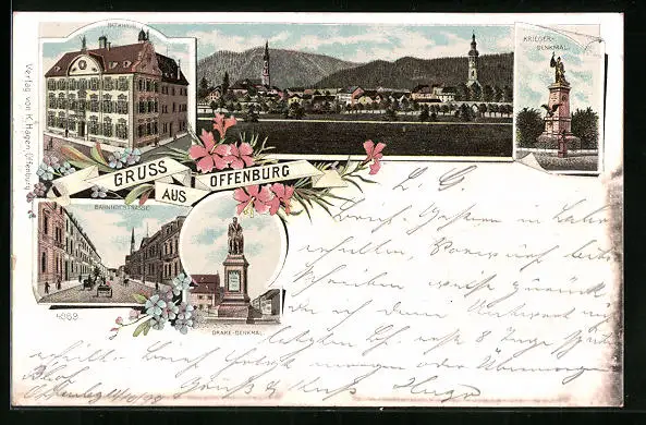 Lithographie Offenburg, Krieger-Denkmal, Drake Denkmal und Total