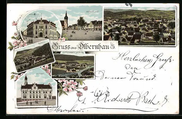 Lithographie Olbernhau i. S., Marktplatz, Postamt, Dörfel, Amtsgericht