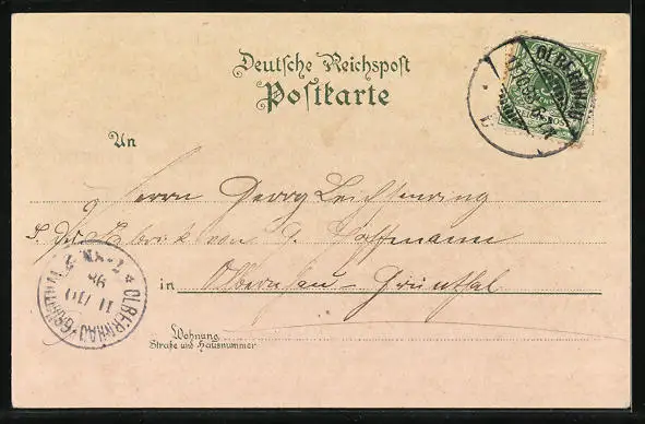 Personenbezogene Daten auf der Rückseite der Karte wurden durch blauen Textmarker unkenntlich gemacht. Die blauen Stellen sind auf die Vorderseite durchgeweicht und wirken sich negativ auf das Postkartenfoto aus