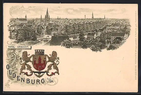 Lithographie Oldenburg / Gr., Totalansicht, Wappen der Stadt